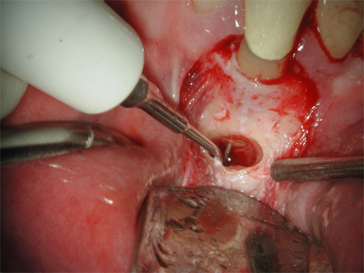 Bu zaman bəzi hallarda kanal müalicəsinin yenidən icrası (endodontik reviziya) mümkün olsa da, bir çox hallarda bu və ya digər səbəbdən həyata keçirilməsi mümkün olmur. Bu zaman əsas tətbiq edilən müalicə metodu dişi çəkməmək şərti ilə, iltihab ocağının uzaqlaşdırılmasını təmin edən – diş kökünün rezeksiyası metodudur. Bu əməliyyat vasitəsilə iltihab ocağı diş kökü ilə birlikdə kənarlaşdırılır və kök kanalları xüsusi metodla yenidən işlənir və doldurulur. Əməliyyat əsasən yerli ağrısızlaşdırma altında, xüsusi böyüdücü vasitənin tətbiqi ilə həyata keçirilir.